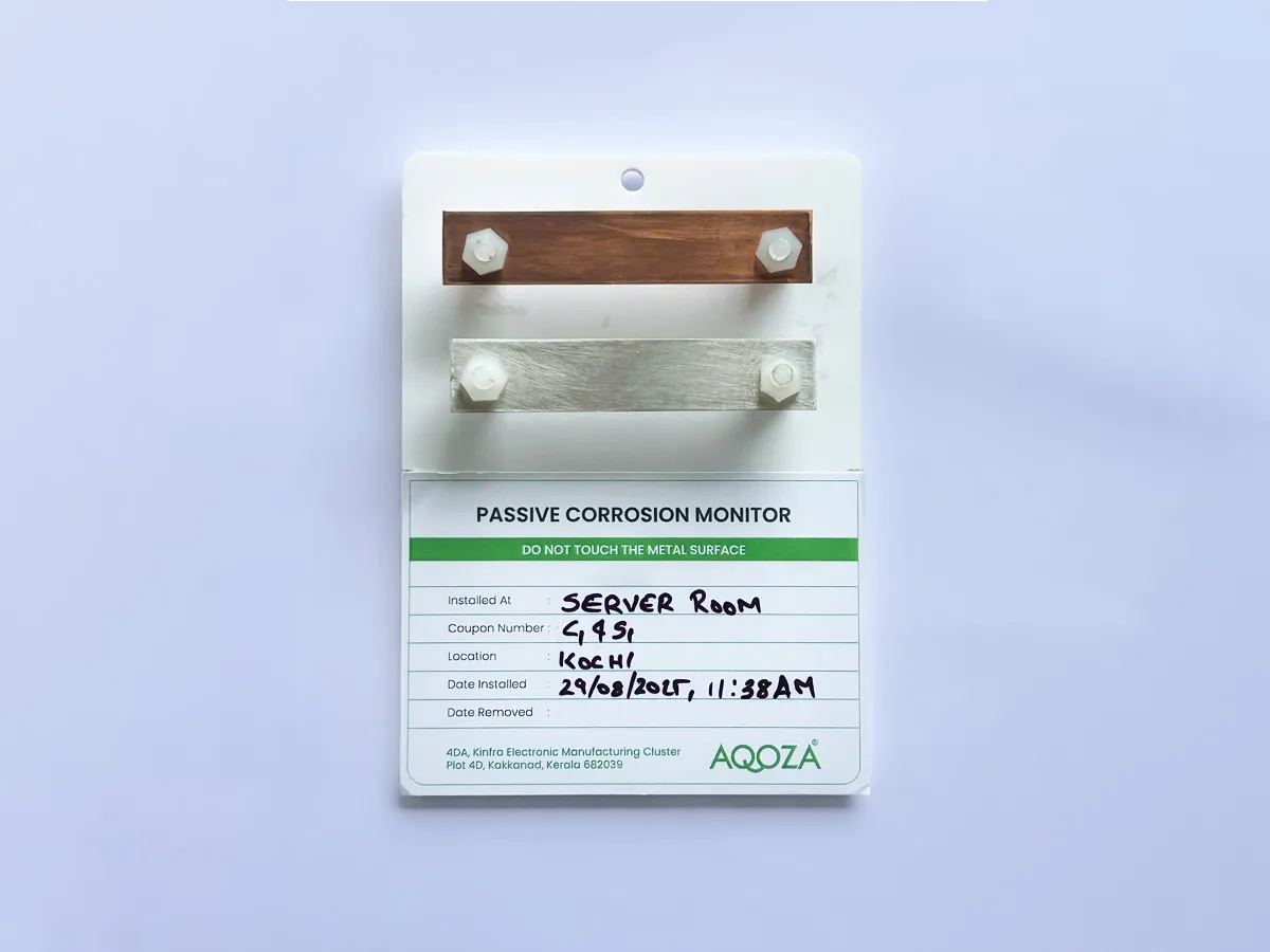 AQOZA’s corrosion coupons are deployed at the site for 30 days and then analyzed in the laboratory to measure the resistance of field-exposed films. Using ER technology, AQOZA determines the corrosion rate and provides a detailed analysis report. This report offers clients a clear understanding of the corrosion levels in their facility, helping them make informed decisions about air filtration needs and preventive maintenance. AQOZA’s Passive Corrosion Monitoring is a cost-effective solution for assessing indoor air quality and safeguarding equipment from corrosion-related damage.